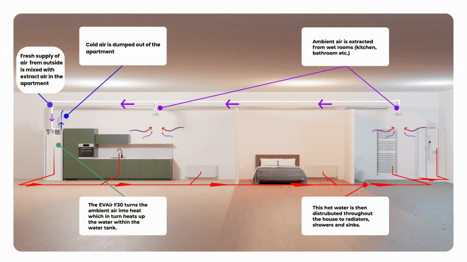 The EVAir F30 is the ideal system to deliver space heating, domestic hot water, and ventilation for new build apartment,s complying with the Part L & Part F of the 2019 Building Regulations.